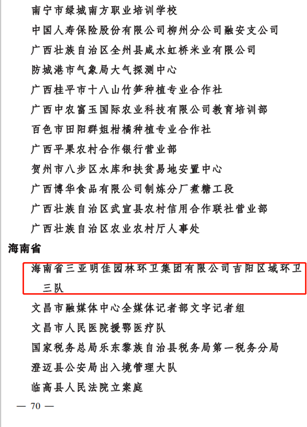 “芬芳三月,如歌巾幗!痹趹c祝第111個(gè)三八國(guó)際勞動(dòng)?jì)D女節(jié)之際,三亞明佳園林環(huán)衛(wèi)集團(tuán)有限公司吉陽(yáng)區(qū)域環(huán)衛(wèi)三隊(duì)榮獲2020年度“全國(guó)巾幗文明崗”榮譽(yù)稱號(hào)!叭珖(guó)巾幗文明崗”是全國(guó)婦女“巾幗建功”活動(dòng)專設(shè)崗, 是全國(guó)婦聯(lián)為表彰積極為國(guó)家、為社會(huì)、為人民做出突出貢獻(xiàn),取得優(yōu)異的優(yōu)秀婦女團(tuán)體而頒發(fā)的榮譽(yù)稱號(hào)。