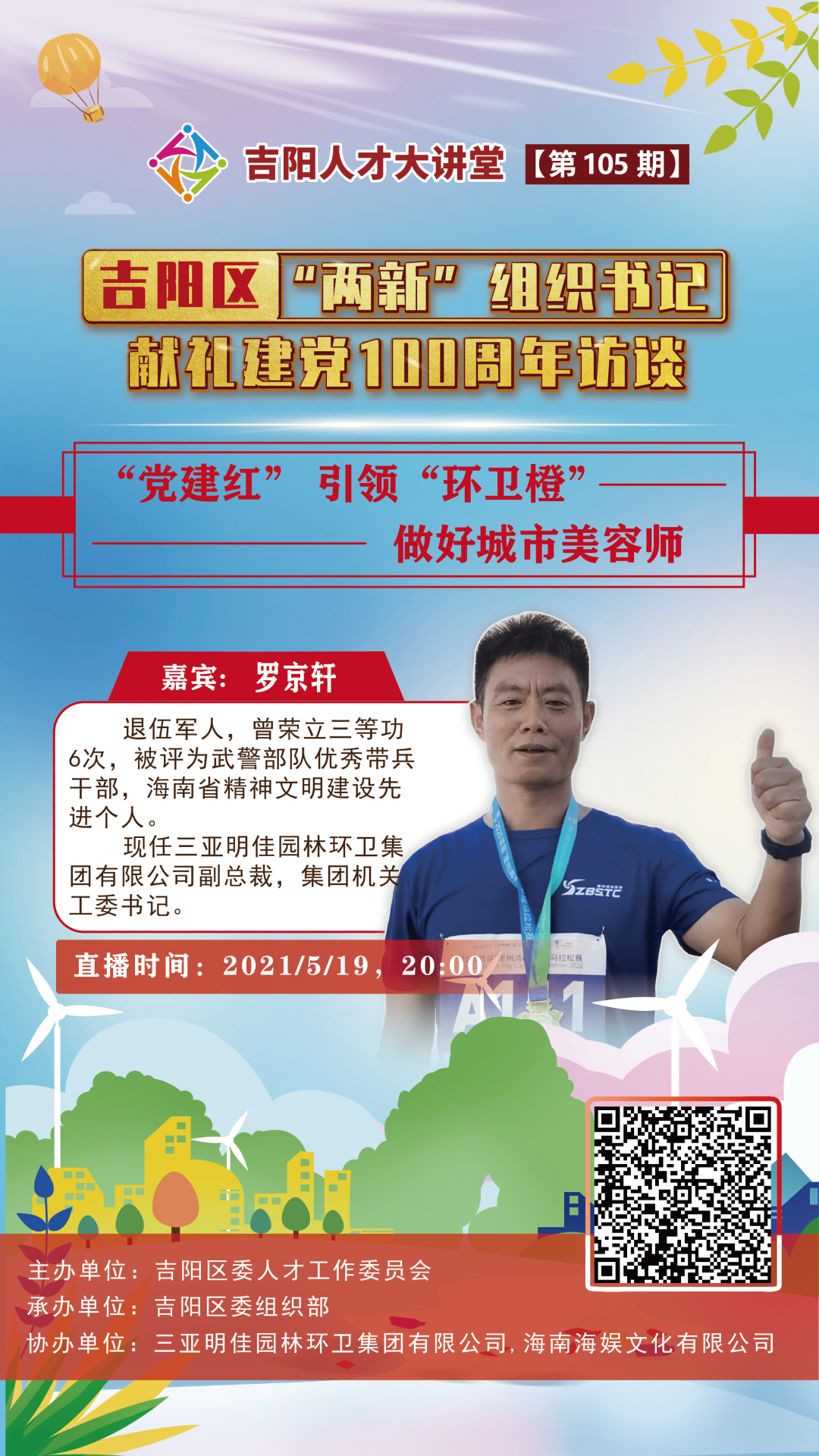 近日,第105期吉陽(yáng)人才大講堂邀請(qǐng)到三亞明佳園林環(huán)衛(wèi)集團(tuán)有限公司副總裁、集團(tuán)機(jī)關(guān)工委書(shū)記羅京軒分享以“黨建紅”引領(lǐng)“環(huán)衛(wèi)橙”,助力城市清潔的好經(jīng)驗(yàn)、好做法,直播吸引近25.48萬(wàn)人次在線(xiàn)觀(guān)看,其中不少網(wǎng)友為來(lái)自全國(guó)各地的環(huán)衛(wèi)工人。