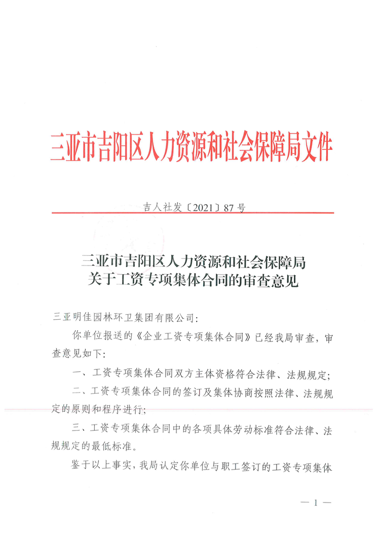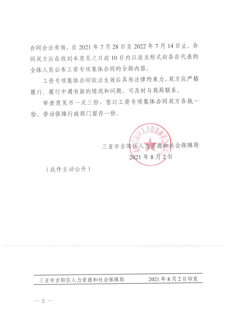 2021年8月2日,吉陽區(qū)人社局審查通過我公司《企業(yè)工資專項(xiàng)集體合同》。8月4日報三亞市總工會基層工作部備案。至此,三亞明佳園林環(huán)衛(wèi)集團(tuán)有限公司2021年度企業(yè)工資集體協(xié)商工作圓滿結(jié)束。
