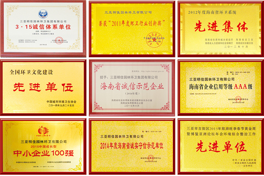 2017年2月1日,分別被三亞市園林環(huán)衛(wèi)局、吉陽(yáng)區(qū)環(huán)衛(wèi)所、天涯區(qū)城管局、海棠區(qū)城管局及三亞市愛衛(wèi)辦等主管部門評(píng)定為“環(huán)境衛(wèi)生先進(jìn)外包企業(yè)”
